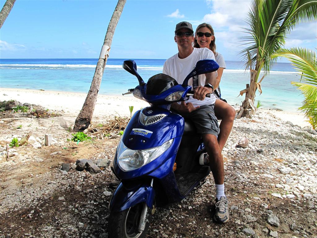 We had planned to leave Rarotonga this morning and head 150 miles north to Aitutaki. So we spent most of the day yesterday doing some final provisioning and visiting the various government offices to officially clear out of Rarotonga. Unfortunately late in the afternoon, Bill discovered a major leak in Solstice’s hydraulic steering system. The good news is that there is someone here that can fix it, but the bad news is that could take a week to get the necessary parts shipped from New Zealand. While we love Rarotonga, we really wanted to move on and see some of the other Cook Islands before our friend John has to fly back home. We are taking it day by day and should have an update on the parts delivery later in the week. As the famous quote says “Cruising is mostly fixing your boat in exotic places”. On the other hand we have had a very fun filled week that has included circumnavigating the island on scooters, doing several dives, attending church service, lots of walking/hiking, lawn bowling, a Polynesian dance show and watching lots of rugby.