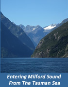After an hour or so of winding our way through the sheer rock cliffs while gazing at glaciers and waterfalls, we reached the Tasman Sea. The Tasman was un-characteristically calm today and allowed the Milford Mariner to go out a little further than normal. From this perspective it was difficult to look back and discern the actual entrance into Milford Sound. Apparently Captain Cook had the same problem, sailing by Milford Sound twice and never seeing it. Too bad he missed it, because it is absolutely stunning.