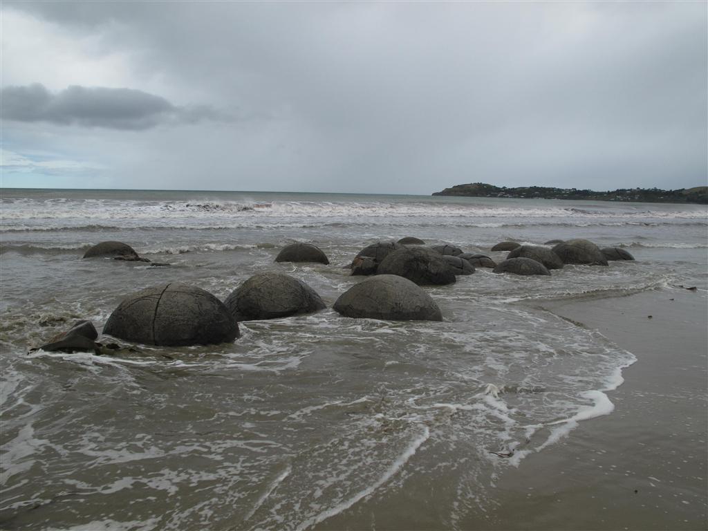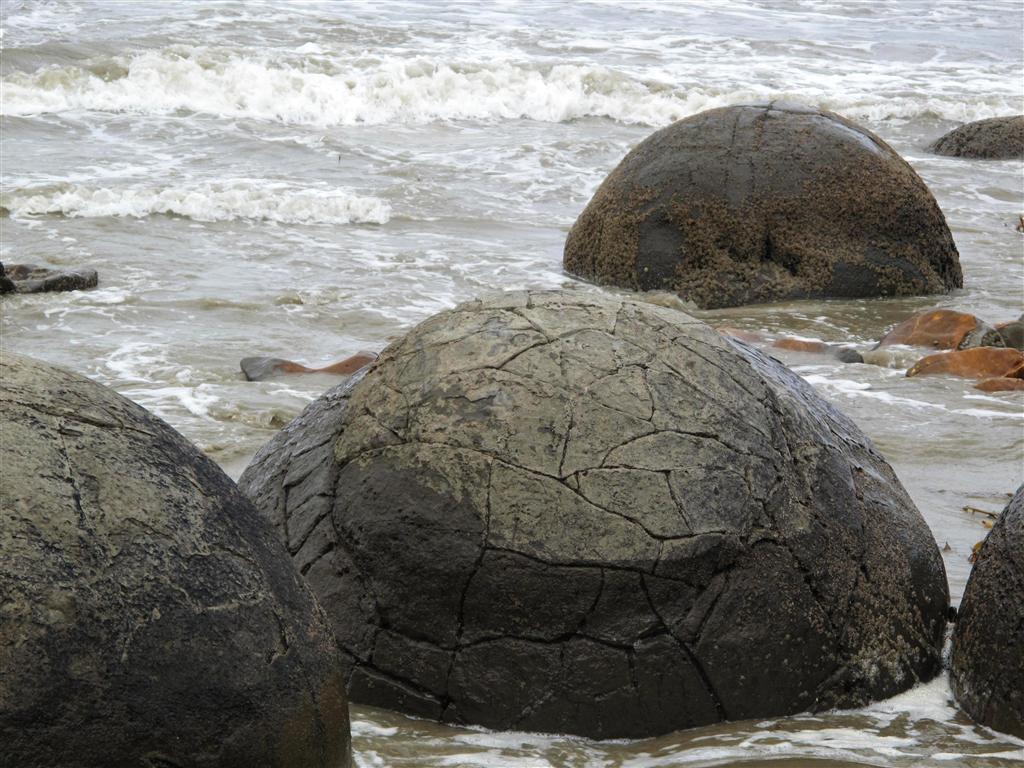 Just south of Oamaru we visited a geological anomaly known as the Moeraki Boulders. Here you are driving along the coast seeing miles and miles of beautiful sandy beach and then all of a sudden there is this small area of beach with these large spherical boulders scattered about. The boulders range in size from 3’ in diameter to 13’ in diameter. According to Maori legend, the boulders are baskets used to carry food onboard the great ancestral wakas (large sailing canoes) that brought the Maori to New Zealand from their spiritual homeland of Hawaikai. This particular waka was shipwrecked just offshore and the baskets washed up on the beach. While there are a number of scientific explanations for how the boulders got there, I prefer the Maori explanation.