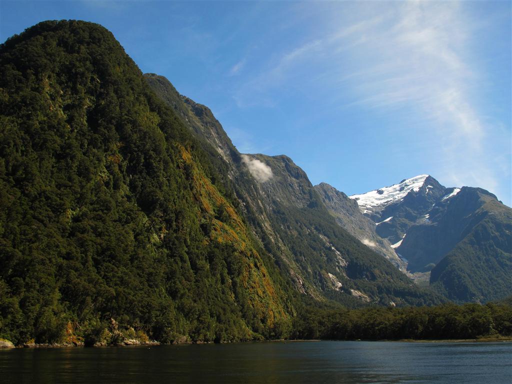 Along the other side of the Sound is Mitre Peak, which rises nearly vertically out of the water and is over a mile high (5518’) from the waterline. The amazing thing is that the sheer rock walls of Mitre Peak continue below the waterline for another 1000’or so. In fact, the average depth of Milford Sound is just over 1000’.