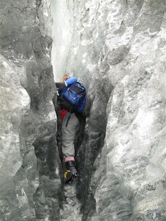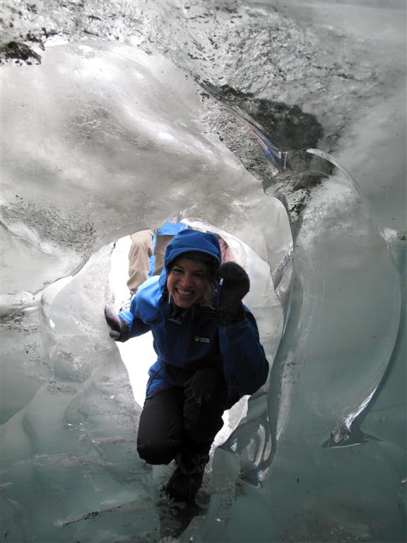 We spent about 3 hours on the glacier winding our way over, around and between mountains of ice, including one really long and narrow crevice. We occasionally had to stop and wait for our guide to cut out new “steps” for us. Like I mentioned earlier, because the glacier is moving so quickly the “steps” that had been cut earlier that morning had already moved/eroded away. Probably the highlight for me was going through a 50 foot long ice cave. The entrance was only about 3’ tall but it quickly opened up to about 6’ tall. The exit of the cave was nearly vertical and as you climbed out all of the ice was the most amazing shade of blue. It was an awesome experience to climb around on this glacier. Jackie was very glad she went, though she’s still not crazy about walking around in crampons.