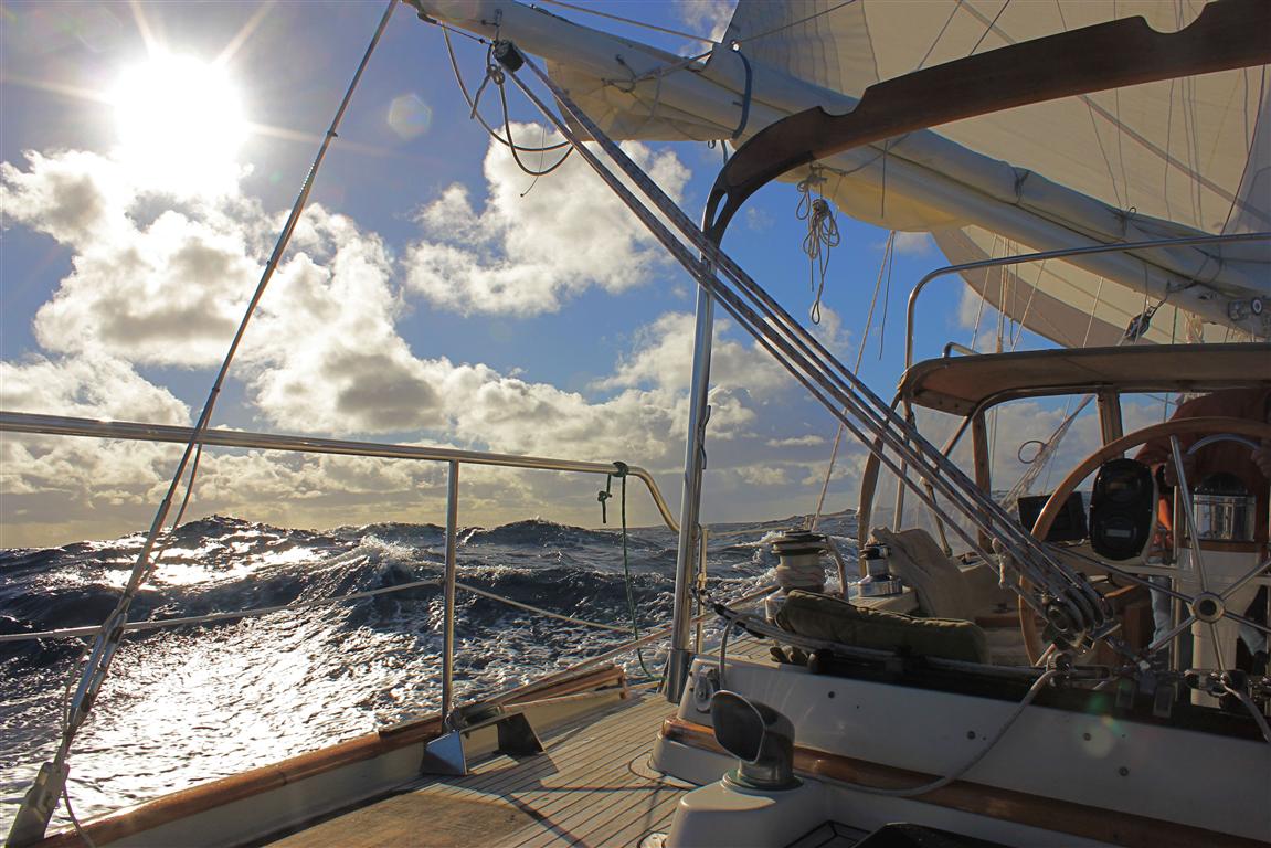 In big wind and seas everything is intensified. And you have to pay close attention to how the boat feels. It’s easy to overpower the boat but it’s also equally as easy to underpower her. The key is finding the right balance. An overpowered boat is very uncomfortable and the rig and boat are stressed and the boat fights the sea constantly trading punches. And that can be dangerous as the sea delivers a much stronger punch than the boat. Imagine the sea as a heavyweight fighter and the boat as Cinderella. When you are underpowered the sea takes the boat and throws her about which ever way she wants without the boat responding because you’ve taken too much of her sailpower away. So the key is for Cinderella to be dressed in a jaw-dropping outfit and with an attitude that makes the fighter want to kiss her not hit her. Taylor is great at finding that adjustment of the correct sail area where Solstice and the sea find the best place together and they take off in a beautiful ballet, swirling, twirling, lifting and catching as they move so wonderfully together. That’s the feel you look to find. And Taylor is great at bringing to the two together.