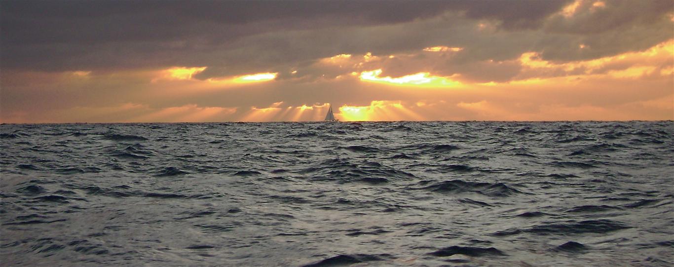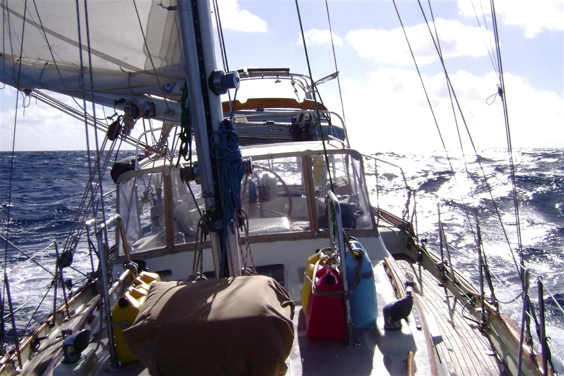 As we hit the crest of the wave Solstice leaned hard to port and rolled down the back side. She released the mainsheet on cue and the boom came swinging over. I ducked just in time and BOOM!