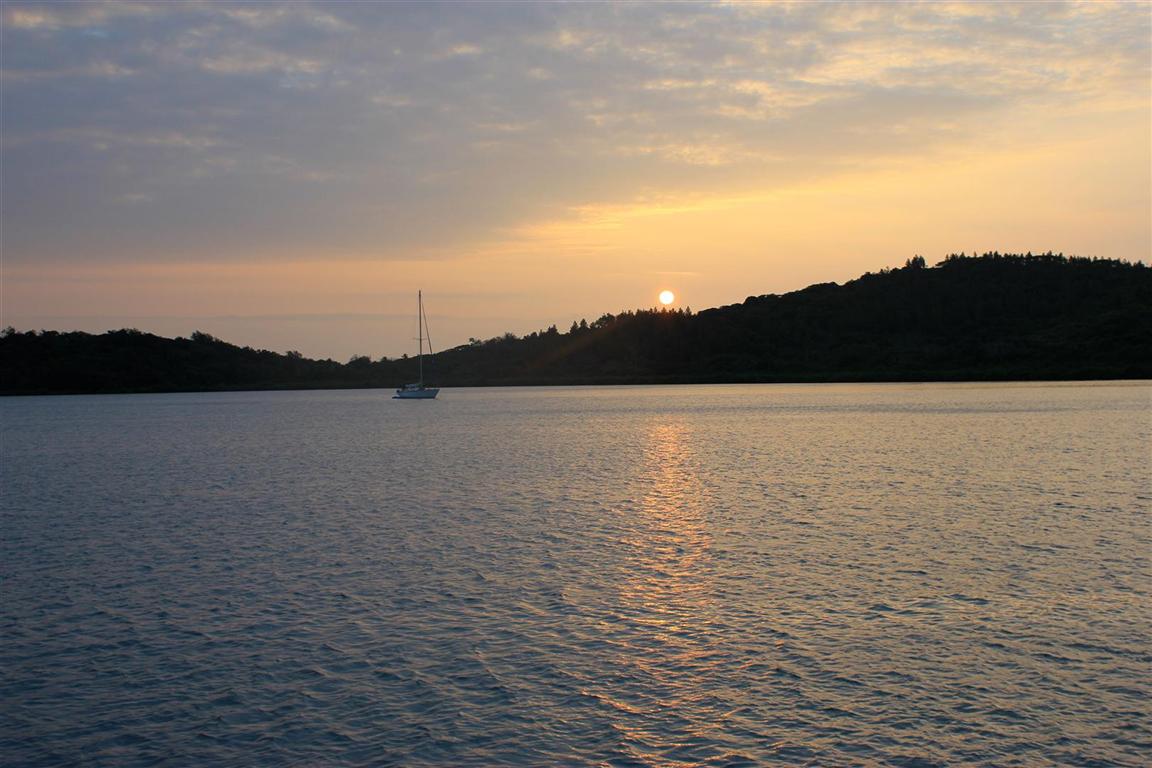 An hour later I had the hook down in a beautiful wide-open bay with only one other boat that was about 100 yards away. A light breeze tickled the sea to just wrinkle the surface. The sunset was a deep orange ball behind a humid atmosphere. It was one of those sunsets you could watch without hurting your eyes. It was comforting and peaceful and a stark contrast to the glare I had been fighting to look through only a few hours before. A calmness and peace filled my soul. The sky darkened and twilight gave way to night. I went below and lay my head down. I breathed in everything that surrounded me. The smell of the tropical air, the sound of the water lapping the sides of the hull and the cool dark light that filled the cabin. I closed my eyes and was asleep as soon as my eyelids had shut.