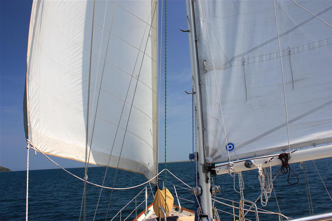 left the main to starboard and pulled the jib through the following wind to port. My sails were set wing to wing. Solstice’s speed jumped up to 7.5 knots. She was like a bird gliding on a gentle thermal without having to flap her wings. Soaring effortlessly, slowly climbing higher and higher. The only thing missing was the flag of piracy flying from my mast.