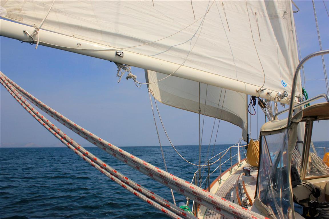 GGGRRRR… I could see the anchor coming up from the depths. I looked up and Solstice bow fell gently off to starboard catching the light breeze on port side. We were drifting towards deep water. I stowed the anchor, hopped down below, flaked the last of the chain and killed the engine. Back in the cockpit I cranked on the starboard winch and the jib rolled out catching her wind. We were sailing.